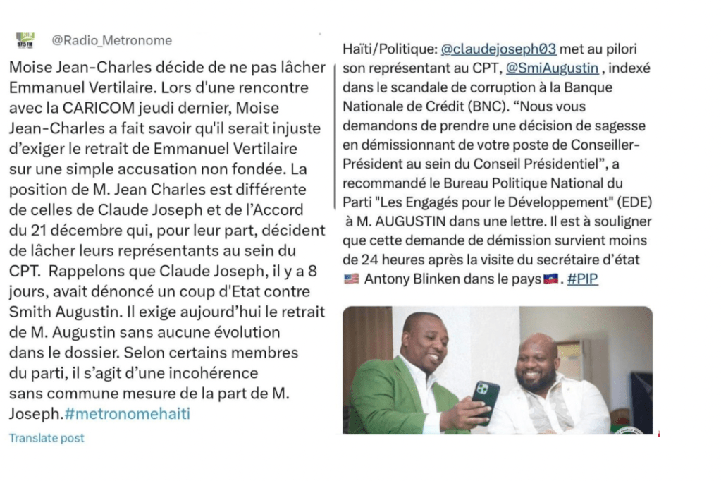 Smith Augustin, représentant désigné par Claude Joseph et membre du parti “Les Engagés pour le Développement” (EDE), se trouve sous le feu des critiques, avec des accusations le liant à un scandale au sein de la Banque Nationale de Crédit (BNC). En réponse, Joseph a demandé sa démission, un geste qui, bien que visant à préserver l’intégrité du CPT, semble précipité sans les conclusions formelles de l’Unité de Lutte Contre la Corruption (ULCC).